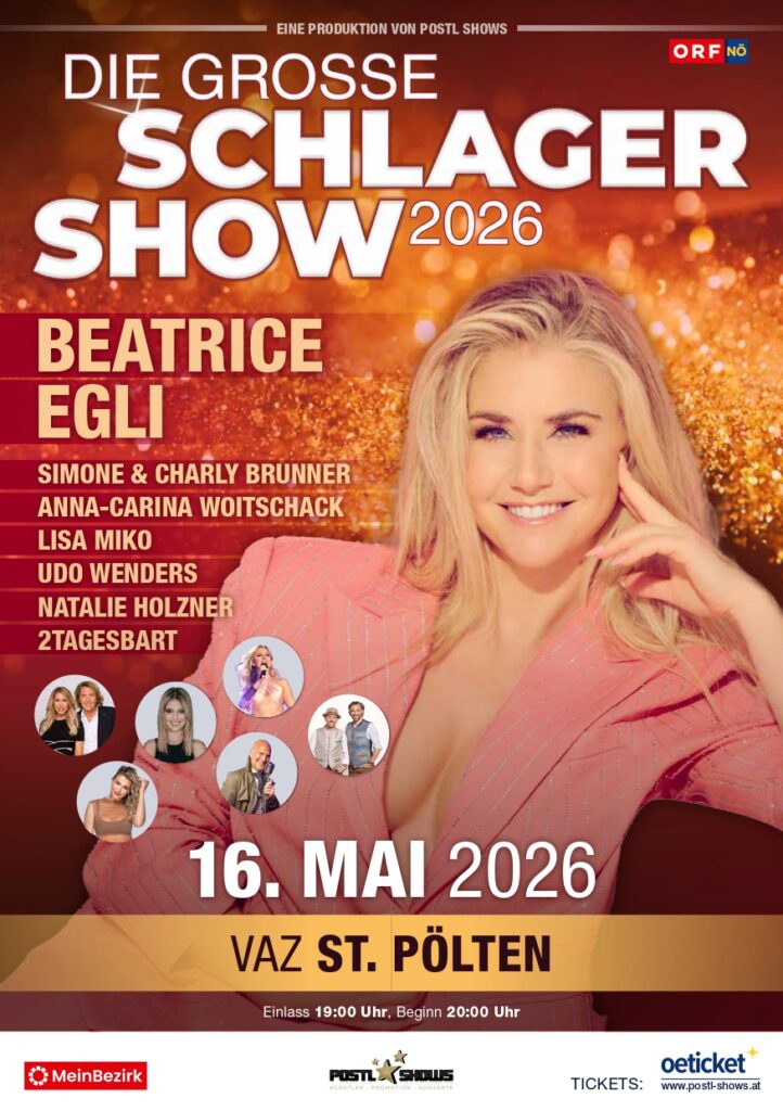 Die Superstars des Schlagers hautnah erleben! Am 16. Mai 2026 verwandelt sich Veranstaltungszentrum (VAZ) St. Pölten in eine Schlager-Hochburg! BEATRICE EGLI, Anna-Carina Woitschack und Simone & Charly Brunner, Lisa Miko, Natalie Holzner, Udo Wenders und das Moderatoren-Duo 2TagesBart vereinen sich auf einer Bühne und werden ihre größten Hits zu einem einzigartigen Liveerlebnis machen. Egal, ob mitreißende Party-Kracher oder gefühlvolle Balladen zum Träumen – „Die große SCHLAGER SHOW“ verspricht eine musikalische Vielfalt und ein Staraufgebot, bei dem jeder Schlagerliebhaber auf seine Kosten kommt. Die Besucher dürfen sich auf mitreißende Auftritte, unvergessliche Duette und eine ganz besondere Stimmung freuen. Mitfiebern, mittanzen und mitsingen – hier ist alles erlaubt! Auf das Publikum wartet eines der größten Schlagerevents Österreichs im Jahr 2026.